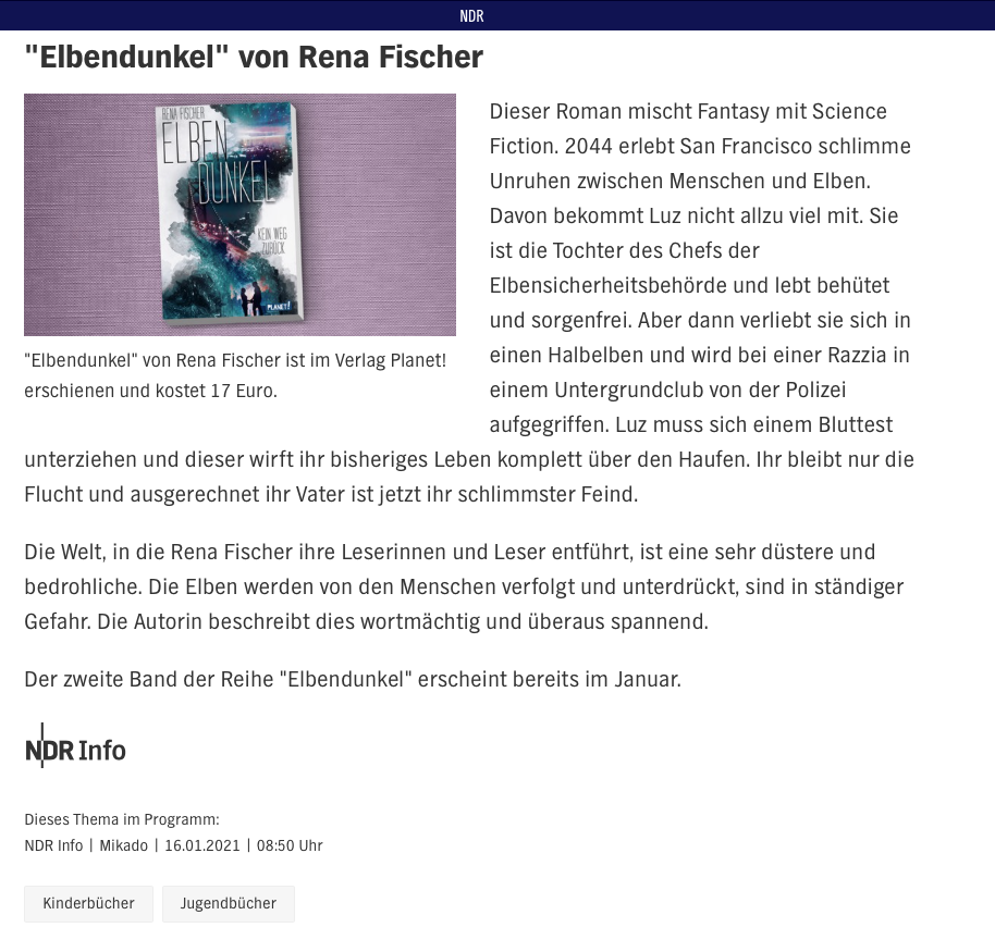 Ich freue mich sehr über die Besprechung und Empfehlung meiner Jugendbuchdystopie durch Katja Essbach von NDR Kultur im Januar 2021.